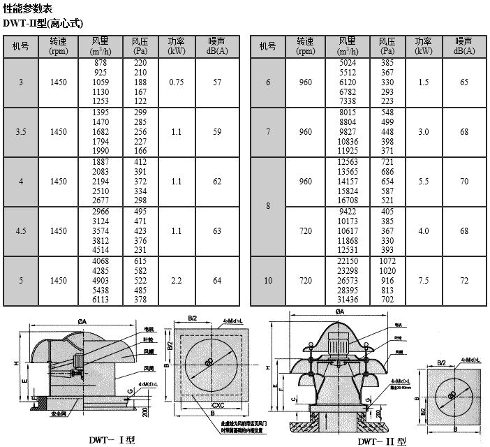 DWT低噪声屋顶风机规格:NO3#-24#风量:1450-220800m3/h风压:62-330pa特点:具有运转平稳、寿命长且各项性能指标在工厂内控标准中的要求均高于 风机行业标准,能确保风机长期稳定地运行。用途:本风机可以根据使用要求,制造成防爆型、防腐型、适用于抗老化抽送、 排易燃、易爆及有腐蚀性气体的场合。
